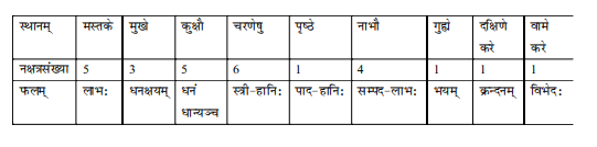 तुम्हे एक कागज पर पुरुष की आकृति बनानी चाहिए या विष्णु जी का फोटो ले और शहर के नक्षत्र से शुरू कर मस्तक में 5 नक्षत्र, मुख में 3, कुक्षी में 5 , चरण में 6, पीठ में 1, नाभि में 4, गुदा में 1, दायें हाथ में 1, बाएं हाथ में 1 नक्षत्र लिख लो, जिस अंग में तुम्हारा जन्म नक्षत्र पड़े उसी के अनुसार फल होगा. मान लो जन्म नक्षत्र उस अंग में पड़ा जिसका फल “भय” लिखा है तो उसे उस जगह निवास नहीं करना चाहिए.