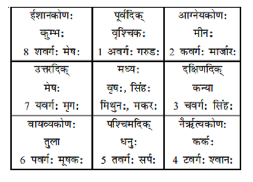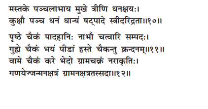 यदि तुम्हारा जन्म नक्षत्र मुख में पड़े तो धन हानि, चरण में पड़े तो स्त्री हानि, गुदा में पड़े तो भय इत्यादि इस प्रकार से समझे. दूसरी विधि ये है कि जिस किसी गाँव/नगर में निवास करना हो तो उस गाँव/नगर को 9 भाग में कल्पित करें और निश्चित करे किस भाग में उस नगर की राशि और जन्म राशि पड़ रही है. राशियों का नियोजन इस प्रकार करे- मध्य में वृष, सिंह, मकर, मिथुन रखे, फिर पूर्व से क्रमश: एक एक राशियों को रखे यथा पूर्व में वृश्चिक, अग्निकोण में मीन, दक्षिण में कन्या, नैऋत्य कोण में कर्क. पश्चिम में धनु, वायव्य कोण में तुला, उत्तर में मेष और ईशान में कुम्भ राशि को स्थापित करे.