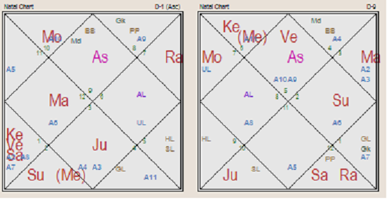 यदि नवमेश दु:स्थान में हो तो जातक भाग्यहीन होता है. ध्यान रहे, यदि यह हॉउस उसका अपना होगा तब ऐसा नहीं होगा, जैसे कर्क लग्न में 6th हॉउस बृहस्पति की मूलत्रिकोण राशि है और यहाँ बृहस्पति बैठे तो हर्षंण योग बना कर जातक के शत्रुओं का नाश कर उसके भाग्य का संबर्धन करेगा. यदपि की 6th रोग-शत्रु का हॉउस है तो वह उसका फल भी अवश्य देगा लेकिन जातक की नियति के बावत उसके प्रभाव को सम्पूर्णता में देखना चाहिए. नवम भाव अष्टमेश द्वारा दृष्ट है और अष्टमेश दु:स्थान में अष्टमेश के नक्षत्र में हैं. यह दोनों स्थितियां भाग्य नाश करती हैं. अष्टकवर्ग में नवम भाव में औसत से बहुत कम बिंदु हैं और नवांश लग्न में सिंह राशि ही उदित है. पराशर की यह बात भी ध्यान देने की है कि यदि लग्न या चन्द्र से 64 वे नवांश अर्थात 8th हॉउस का नवांश उदित हो या लग्न और चन्द्र से सप्तम या द्वितीय भाव का नवांश उदित हो तो पाप-मारक ग्रह की दशा में अशुभ परिणाम प्राप्त होते हैं.