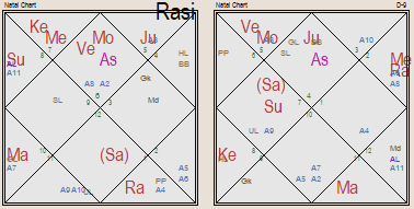 अपरोक्त कुंडली एक बार डांसर और प्लेबॉय मॉडल की है जिसने एक 90 वर्षीय तेल व्यापारी बिलियनेयर से बृहस्पति-शनि दशा में शादी की और $475 मिलियन डॉलर की मालकिन हो गई थी. चार साल बाद यह प्राप्त सम्पत्ति उसे छोडनी पड़ी थी क्योकि पंचम भाव को उच्च के अष्टमेश ने नष्ट कर दिया है. कुंडली में पंचमेश-नवमेश-धनेश-एकादशेश योग उपस्थित है.