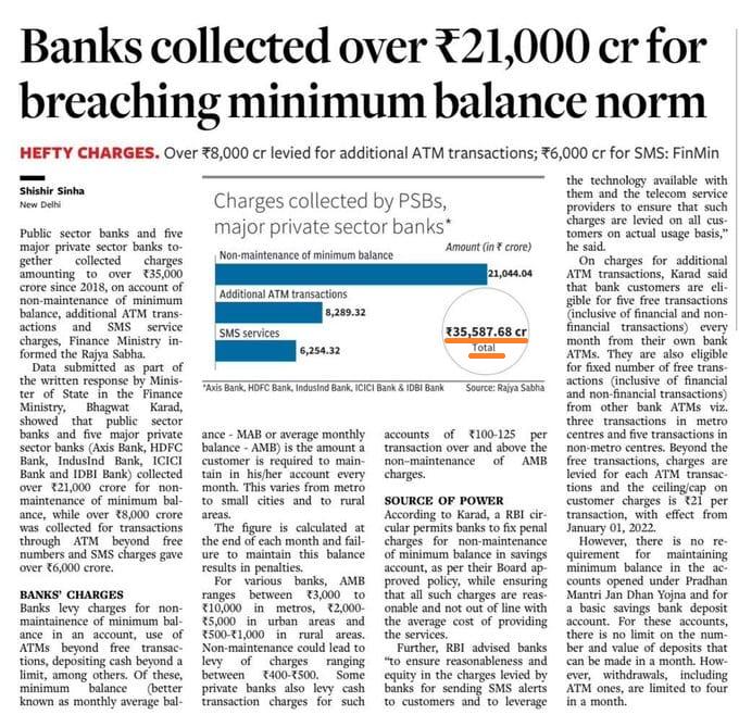 Total of 51.04 crore Pradhan Mantri Jan Dhan Yojana (PMJDY) accounts have been opened which means every month Rs 500 is extracted for NOT MAINTAINING minimum balance from the poor which is roughly 25500 crore.