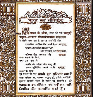 हम, भारत के लोग,( We, the people of India) भारत को एक सम्पूर्ण प्रभुत्व-संपन्न, समाजवादी, धर्मनिरपेक्ष और लोक्तान्त्रमक गणराज्य बनाने के लिए तथा उसके समस्त नागरिकों को