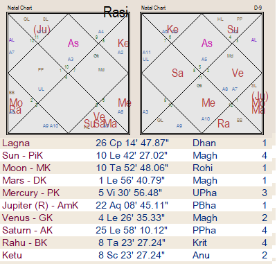 सप्तम लार्ड पंचम हॉउस में पाप ग्रह के साथ युत है और अष्टम से लग्न लार्ड और द्वितीयेश द्वारा दृष्ट है. एकादशेश मंगल शुक्र की युत है और द्वादशेश पर तीनों ग्रहों की दृष्टि है. यह स्त्री में कमी, मृत्यु और कलहपूर्ण अलगाव को दर्शाता है. लग्नेश के अष्टम होने से चतुरसेन लंबे समय तक आर्थिक पारिवारिक परेशानियों से घिरे रहे.