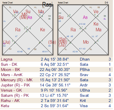 स्थान -कमारपुकुर (पश्चिम बंगाल) प्रथम कुंडली से लग्न कुम्भ, नवांश-तुला है.