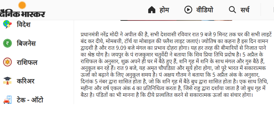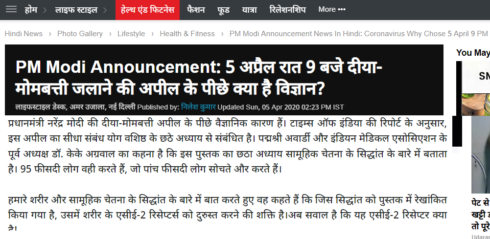 दैनिक जागरण, अमर उजाला, नवभारत टाइम्स इत्यादि में प्रोपगेंडा किया गया कि मोदी जी देश को कोबिड-१९ से बचाने के लिए वह सब कर रहे हैं जो भगवान राम ने किया था. फासिस्ट समर्थक डाक्टर्स ने भी प्रोपगेंडा में काम किया और जनता को गोदी मीडिया द्वारा बतलाया कि किस तरह सामूहिक चेतना से लोगों के शरीर के एसीई-2 रिसेप्टर्स (एक एंजाइम ) नियंत्रित हो जायेगा. जो मानव शरीर के हृदय, फेफड़े, धमनियों, गुर्दे और आंत में कोशिका की सतह से जुड़ा होता है। यह रिसेप्टर गंभीर सांस संबंधी सिंड्रोम का कारण बनने वाले कोरोना वायरस के लिए कार्यात्मक और प्रभावी होता है।