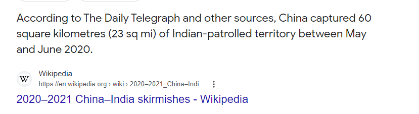जबकि तथ्य क्या है ? चीन ने भारत की  60 square kilometres (23 sq mi) जमीन हड़प ली है. नीचे विकीपीडिया का पेज का स्निपेट दिया गया है . ये अल्प बुद्धि कमोवेश निपढ ज्योतिषी फासिस्टों के साथ मिलकर इस ठगी के इतर क्या कर सकते हैं? ज्योतिष और आध्यात्म ऐसे मूर्खों की चीज नहीं है, यह एक बहुत उन्नत चेतना से सम्पादित की जाने वाली विद्या है. .