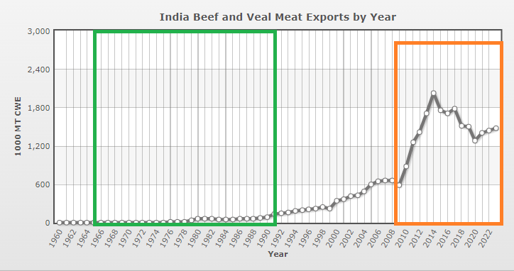 इस कार्य के लिए ही बीफ एक्सपोर्ट करने वाली कम्पनियों से मोदी ने 250 करोड़ चंदा लिया. इस चंदे के कारण ही देश में गौहत्या बहुत तेजी बढ़ी और पूर्व की कांग्रेस सरकार की तुलना में कई गुना बढ़ोत्तरी हुई. नीचे दिए गये चार्ट में हरे रंग में घेरे गये वर्षो को देखें जब कांग्रेस की स्ट्रांग सरकार थी तब बीफ निर्यात न के बराबर है, जब कांग्रेस कमजोर हुई और भाजपा सत्ता में आई तब बीफ का निर्यात बढ़ा जिसे भगवा रंग में घेरा गया है.
