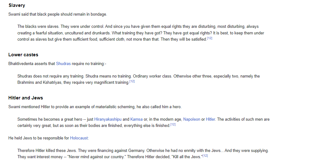 He was similar kind of hatemonger as all fascists are in all over the world. The effect of Satanism on ISKCON is so much so that several of Satanists in the saffron garb have been arrested for rape and charges of sexual assault. One of his American Satanist chela Bhaktipada ( original name Keith Gordon Ham) also known as Kirtanananda Swami, who led the American branch of the Hare Krishna movement was imprisoned for sexual molestation and a federal investigation for mail fraud, racketeering, conspiracy and also murder of two devotees.