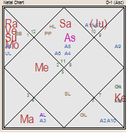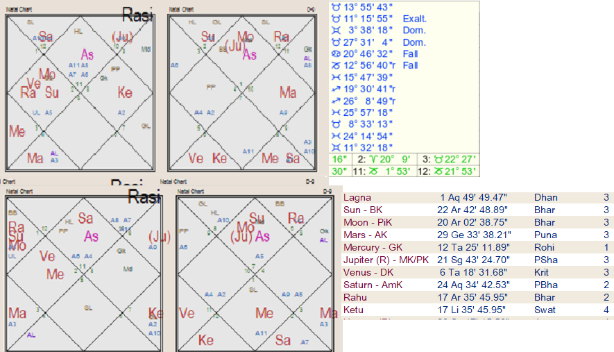 Look at D-10 chart. Here too lagan is vargottam and Saturn and Jupiter are exalted. Mercury is vargottam in D-10 and aspected by 7th lord Sun from 10th house making him world famous. Exalted lord of Lagan is aspecting Jupiter and Venus making him a great political thinker and philosopher. Jupiter being evil is in the nakshatra of Yogakarak in lagan chart hence he gave result mostly of yogakarak . He remained badly ill and died in madhya-ayu at 64 years because he was born on Amavasya day. Moon is eclipsed by Rahu, 22nd Drekkana is of Venus, Rahu is stationed there in his nakshatra. In Drekkana Venus is debilitated in 12th house aspected by Saturn. Jupiter is 6th lord in Drekkan aspected by karak of 6th house and in Navansha Mars is marak, he died in Jupiter-Rahu mahadasha due to bad health.