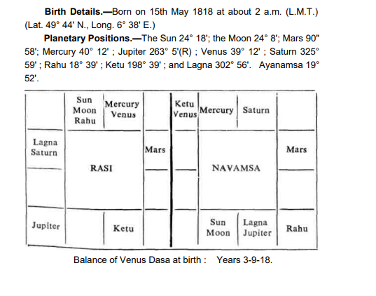 In this chart lord of 10th house Mars is not debilitated rather is going towards its house of debilitation (Mars is debilitated at 28 degree Cancer). It is Vargottam and is in opposition and aspected by strong Jupiter in both lagan chart and Navansha. (Raman did not take this in consideration). Jupiter is lord of 2nd and 11th house (MONEY) almost in commanding position and directs Mars accordingly. His Karkansha lagan is Gemini in which Jupiter is 10th lord. Lagan lord is in 12th house with Venus. He lived most of his life outside of his native place working on political economy. In Karkansha lagan Mars is 6th lord aspected by marak Jupiter who has kendradhipatya dosh, his aspect making him ill. Mars being 6th lord in the end of last degree made him sick and mostly gave him stomach problem. Mars is karak of 6th house in Mercury sign vargottam gave him skin problems and boils on skin. In Navansha Libra is rising (9th house) and Saturn-Venus are in Rashi-Parivartan Yoga which means that he was a great man of virtue and a spiritual man (He was born in the Venus dasha and in navansha yoga karaka are in rashi parivartan yoga. Interestingly in Aquarius Venus is Yogakarak and in Libra Saturn is Yogakarak.). It makes his chart very powerful. He was in fact born as a mahapurush to do loka-kalyan (betterment of humanity). Yogakaraka Venus is in nakshatra parivartan yoga with 7th lord Sun who is exalted in third house of publication hence he was destined to make history through writing. Mars is the third house lord of publication and writing in 5th house ( great virtue, knowledge, higher learning etc.), his Mars major period began in 1844. in Mars-Mercury dasha he published The Manifesto of the Communist Party (21 February 1848). Mars is in Mercury sign and Mercury is almost conjunct with Yogakaraka. In Navansha Mercury is in 7th house of masses aspected by 3rd ,10th lord and 11th lord which makes him world famous. Here important thing is that Jupiter is 11th house and 2nd house lord aspecting Mars the 3rd lord means Friedrich Engels, his friend whom he treated as his younger brother. Friedrich Engels was a wealthy and owned large cotton-textile mills in Prussia and England. He met Marx in 1844 in the beginning of Mars dasha. In Rahu-Venus period which began after Mars was over, he wrote greatest book “Das Kapital” of 19th century in 1867. Rahu is conjunct with Sun-Moon both making it international. If we believe in Uttarkalamrit, Rahu is ‘antyaja’ means lower classes. Rahu is shanivat hence what Saturn represent he also represents. Das Kapital is about the classes represented by both planets. Mars period was not good for health and income for many reasons. “Ucch-nichantarsthsya dasha Syadvrohini..kleshacchubham narah” If a planet is situated in between his sign of exaltation and sign of debilitation, his dasha is called avarohini. It gives suffering (klesh). Another reason is that Jupiter is vipat tara (danger) from lagan and Mercury in whose sign Mars is vargottam is pratyak tara(obstacles). Rahu is Pratyak tara from his Moon and Jupiter is Sadhana. In both ways you can see it. Both are experienced in dasha of Mars, Rahu and Jupiter. A benefic in 6th or 3rd house from lagan Arudha makes one a Sadhu. His Jupiter is 6th from his Lagan Arudha in the nakshatra of Yogakarak, makes him a great Tapasvi. His works “Das Kapital, Grundrisse, A Contribution to the Critique of Political Economy, The Poverty of Philosophy etc. are the work of a Tapasvi. He badly suffered from ill health and financial problems yet he worked for the oppressed. The dominance of Venus can be seen in his birth chart. It is because of dominance of Venus, majority of children were girls.