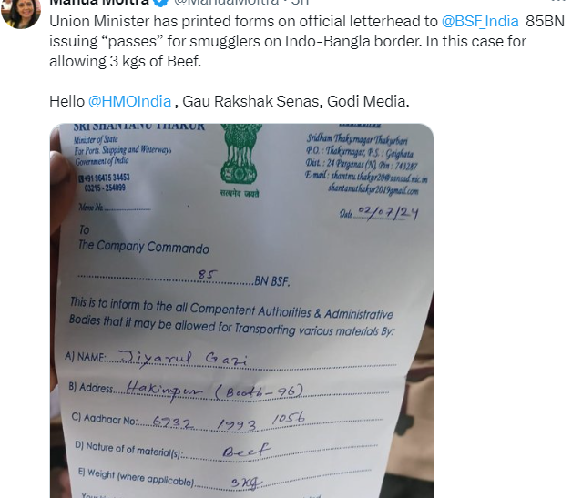 नरेंद्र मोदी की भाजपा सरकार पर अब हिन्दुओं का पूरी तरह से भरोसा उठ गया है. इलेक्टोरल बांड्स के खुलासे के बाद, जिसमे बीफ निर्यात करने वाली कम्पनी से मोदी ने 250 करोड़ लिए थे, अब एक नया खुलासा हुआ है.पश्चिम बंगाल में बंगलादेश-भारत बार्डर पर बीफ की तस्करी में भाजपा शरीक है. बीफ की तस्करी सरकार के मंत्री करवाते हुए धरे गये हैं. केंद्रीय मंत्री ने आधिकारिक लेटरहेड पर बीफ निर्यात के फॉर्म छपवाए हैं और बीएसएफ को जारी किया है. टीएमसी सांसद महुआ मोइत्रा ने अपने ट्विटर हैंडल से इस लेटर पैड की फोटो ट्वीट किया है.