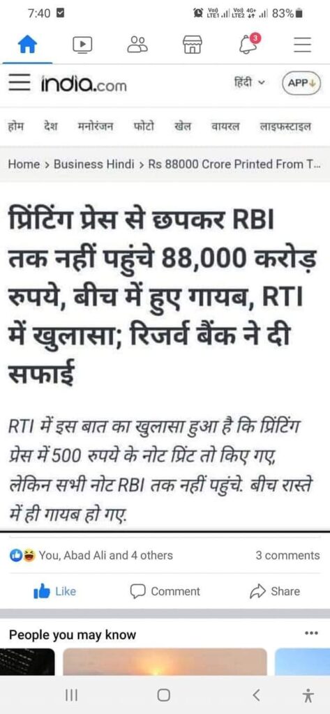 मीडिया की खबरों के अनुसार भारी मात्रा में 500 रुपये के नोट छपने के बाद मार्केट सर्कुलेशन से गायब हैं. करीब 88000 करोड़ रुपये मूल्य के नोटों की छपाई हुई, लेकिन नोटों का हिसाब-किताब नहीं है. ये रिपोर्ट RTI से मिली जानकारी के हवाले से सामने आई है. द फ्री प्रेस जर्नल ने 17 जून को आरटीआई के जवाब के आधार पर रिपोर्ट छापी थी. आरटीआई एक्टिविस्ट मनोरंजन रॉय को इसकी जानकारी मिली थी. इसमें कहा गया कि प्रिटिंग प्रेस में 500 रुपये के 8810 करोड़ नए नोट छापे गए. इनमें से सिर्फ 7260 करोड़ नोट ही RBI को मिले. बाकी 1760 करोड़ नोट कहां गए, इसकी कोई जानकारी नहीं है? इन गायब नोटों का मूल्य करीब 88 हजार करोड़ रुपये हैं. 88 करोड़ रूपये नरेंद्र मोदी की चौकदारी में रास्ते में ही लूट लिए गये. यह नारा सही ही निकला कि ‘चौकीदार ही चोर है”.