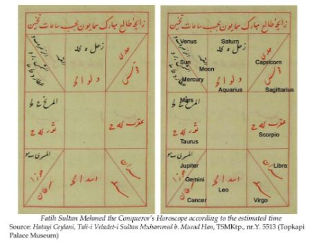 .ओटोमन सम्राटों द्वारा प्रयुक्त चीजों पर ज्योतिष के मोटिफ, कुरान के सूरे के साथ अंक ज्योतिष जैसे कुछ मोटिफ मिलते हैं और क्योंकि ज्यामिति में परसिया सबसे अग्रणी था इसलिए ज्यामितीय आकृतियाँ भी मिलती हैं. कुरान की आयतों को ज्यामितीय आकृतियों में बंद कर वे जादुई यंत्र का निर्माण करते थे जैसे हिन्दू मन्त्रों को वृत्त इत्यादि ज्यामितीय आकृतियों में घेर कर यंत्र बनाते हैं. ज्योतिष में वे काफी अग्रणी थे इसलिए उनके द्वारा ज्योतिष का प्रयोग कोई नई बात नहीं है. ओटोमन दरबार में नियुक्त ज्योतिषी राजाओं, मंत्रियों और अधिकारीयों की जन्म कुण्डलियाँ बनाते थे, साथ में ऐसी कुंडलियाँ भी म्यूजियम में संरक्षित हैं जो किसी विशेष यात्रा, युद्ध, विवाह, सन्तति इत्यादि के लिए भी बनाई गई थीं .