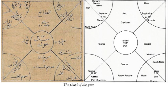 तुर्की का ज्योतिषीय ज्ञान का इतिहास बहुत प्राचीन है. 1st सेंचुरी 14 जुलाई 109 bc का यह horoscope विश्व इतिहास का पहला पत्थर पर लिखित दस्तावेज है. चन्द्रमा सिंह राशि में है और चार प्रमुख नक्षत्र लाल स्टार में अंकित हैं. तारों की यह स्थिति पुन: 25000 साल बाद आएगी .