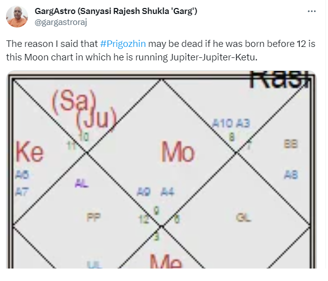 Prigozhin was running Jupiter-Jupiter dasha. Jupiter is in 2nd house which is strong marak house aspected by debilitated 12th lord Mars from 8th house. Mars is also aspecting Ketu. Jupiter is in the house of debilitation and in the nakshatra of 8th lord. Jupiter is all capable to kill in his dasha. Atma karaka is Rahu in 9th house of long travel whose lord is in 6th house aspected by Jupiter. On the day of Transit Jupiter is aspecting Sun, 8th lord Moon and Ketu both. Mars is aspecting ascendant, Rahu and Jupiter. Saturn was transiting over natal Ketu and Sun was transiting over natal Rahu. Plane crash happened when Sun transited over Rahu and formed opposition with marak lord of second house Saturn.