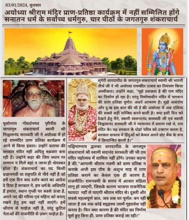 मीडिया रिपोर्ट के अनुसार राममन्दिर का निमार्ण होने में अभी 2-3 साल लगेंगे. मन्दिर के प्राणप्रतिष्ठा की जल्दबाजी का धर्म से कोई लेना देना नहीं है, यह एक राजनीतिक कार्यक्रम है जिसमे अधर्म किया जा रहा है. हिन्दू धर्म में अधूरे बने घर में गृहप्रवेश नहीं किया जाता है यहाँ भगवान का प्रवेश 30% बने मन्दिर में किया जा रहा है. एक शिखर विहीन अधूरे मन्दिर में देवता की स्थापना नहीं की जा सकती है.