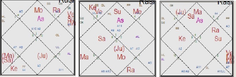 उदाहरण के लिए इन तीन जन्मकुंडलियों को देखे , ये कुण्डलियाँ बिहार पटना की तीन सगी बहनों की हैं।तीनो बहनों में सबसे बड़ी की ज्यादा उम्र में शादी हुई लेकिन 3 वर्ष बाद कलह हुआ और पति ने भगा दिया और दो की शादी ही नहीं हो पा रही है। दोनों बहनों की उम्र शादी की उम्र को पार कर चुकी है- एक 37 वर्ष की है दूसरी 39 वर्ष की है। इन कुंडलीयों में जीवात्मा का इहलोक खराब है इसलिए इन्हें बड़े उपाय करने पड़ेंगे। कुंडली में जो दोष हैं उसके निवारण से कर्म ठीक होता है और पुन: चीजें घटित होने लगती हैं।