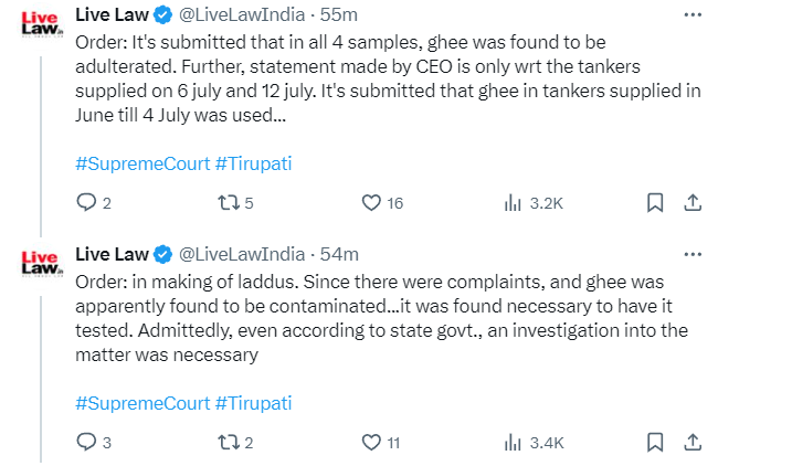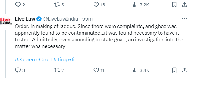 तिरुपति मंदिर के लड्डुओं में जानवरों की चर्बी वाले घी के इस्तेमाल पर सोमवार को सुप्रीम कोर्ट में सुनवाई हुई. जस्टिस बीआर गवई और केवी विश्वनाथन की बेंच ने चन्द्रबाबू नायडू लताड़ लगाते हुए कहा- ‘जब प्रसाद में पशु चर्बी होने की जांच CM चंद्रबाबू नायडू ने SIT को दी. तब उन्हें मीडिया में जाने की क्या जरूरत थी? भगवान को तो राजनीति से दूर रखें.’ सुप्रिम कोर्ट में यह केस सुब्रह्मण्यम स्वामी, वाई॰ एस॰ राजशेखर रेड्डी और तिरुपति मन्दिर ट्रस्ट ने किया था.