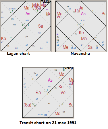Rajiv Gandhi was assassinated on 21 may 1991, he was running Rahu-Ketu-Mercury period. From his natal moon vainashik nakshatra lord is Moon who is in 12th house in Natal chart. From his natal moon, Nidhan nakshatra lord is Saturn. From Ascendent Vainashik nakshatra lord is Rahu and Nidhan nakshatra lord is Ketu both were in Dasha. Marak Jupiter is in Nidhan nakshatra. Jupiter and Venus are his major marak planets. Moon is in Leo 12th house in the nakshatra of Venus and conjunct with Venus. Moon is lord of his 87th navansha. Saturn is seated in Vainashik nakshtra.