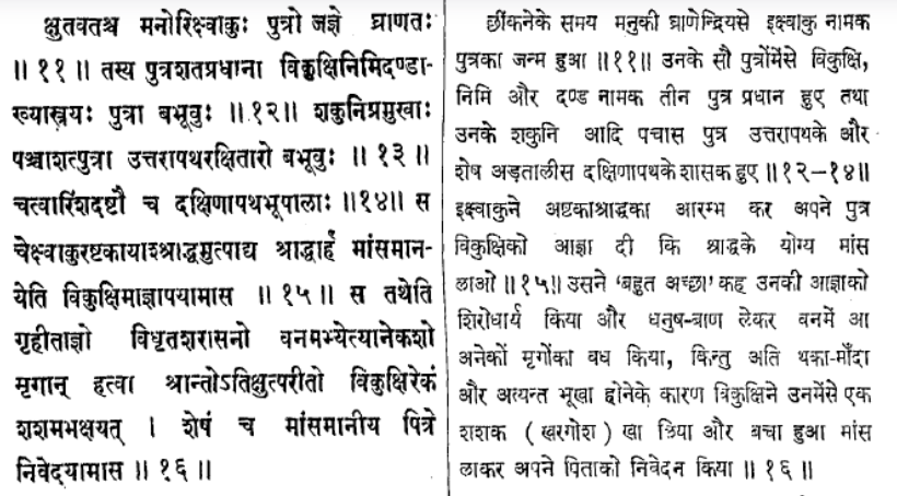 वैवस्वत मनु के नौ पुत्र हुए – इक्ष्वाकु, नभग ,धृष्ट, शर्याति, नरिष्यन्त, प्रांशु, अरिष्ट, करूष और पृषध्र . वैवस्वत मनु की एक पुत्री भी हुई, पुत्री का नाम इला था. यह इला ही सुद्युम्न बन गई थी जिससे चन्द्रवंश का विस्तार हुआ इक्ष्वाकु कोसल राज्य के राजा थे. राजा इक्ष्वाकु को ही जिनको जैन लोग भगवान ऋषभदेव मानते हैं जो कि गलत है. भरत वंश में ऋषभदेव हुए लेकिन वे सन्यासी परमहंस हो गये थे इसलिए उनसे कोई वंश नहीं चला. राजा इक्ष्वाकु के राज्य की राजधानी अयोध्या थी. उनके १०० पुत्र बताए जाते हैं जिनमें ज्येष्ठ विकुक्षि था. विकुक्षि का वर्णन वाल्मीकि रामायण में आता है. इक्ष्वाकु ने पितरों को पिंडदान करने के लिए उसे खरगोश मार कर लाने के लिए भेजा था. उसने शिकार किया और भूख लगने के कारण उसने कुछ खरगोश भून कर खा लिए थे.