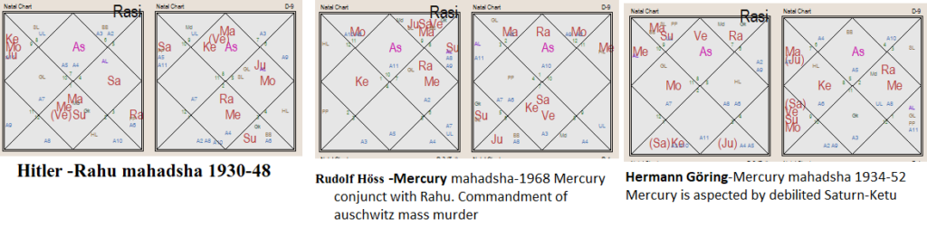 ये तीन कुंडली सबसे बड़े रक्त पिपासु नाजियों की है सब एक जैसी दशा में चल रहे थे. हमने 35 से ज्यादा नाजियों की कुंडली बनाई और देखा तो मुझे यह पता चला कि सभी नाजी क्रूर ग्रहों की दशा में थे जब उन्होंने नाजी पार्टी में प्रवेश किया. जर्मनी का पूर्ण क्रिमिनलाइजेशन क्रूर-पाप ग्रहों के कलेक्टिव प्रभाव में ही सम्भव हुआ. राहु की महादशा में आप कभी भी बृहस्पति की दशा में चलने वाले व्यक्ति के साथ नहीं चल सकते, उनसे मुलाक़ात और बात ही नहीं बनेगी. मोदी की महादशा में शनि-राहु प्रभावित लोग ही उससे जुड़े जो मूलभूत रूप से क्रिमनल स्वभाव के, घृणास्पद, धूर्त और ठग थे इसलिए उनका कलेक्टिव प्रभाव भी देश की जनता पर वैसा ही पड़ा. उसके सबसे करीबी लोगो का चार्ट उठा कर देखे तो यह बात आपको स्पष्ट होगी. मोदी का सबसे करीबी अमित शाह राहु की महादशा में था. मति मारने का उपक्रम ठगों का एक बड़ा रैकेट ने किया जिनकी क्रूर-पाप ग्रहों की दशा चल रही थी और प्रधान सेवक की दशा के साथ पूर्ण सामंजस्य में थी. आसुरी प्रकृति के धूर्त लोगो ने धर्म को ताक पर रखकर विधिविहीन रिक्शा पर कड़ाही में हवन करते फिरे और जनता को इस तरह बेवकूफ बनाया और ठगा.