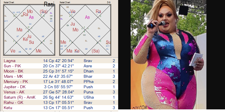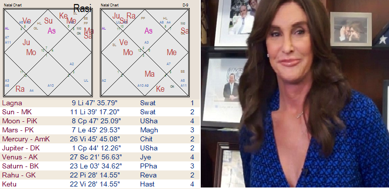 Planets for Transgender are Mercury, Saturn, Rahu-Ketu and Common sign. Influence of these planets on Ascendant, Ascendant lord, Sun, Moon, 7th lord makes one transgender. Have a look at 3 example charts taken from data bank and are mostly correct. The first chart is of Caitlyn Jenner. She is American television personality and retired Olympic gold medal-winning decathlete. Previously identifying publicly as male, Jenner revealed her identity as a trans woman in April 2015.