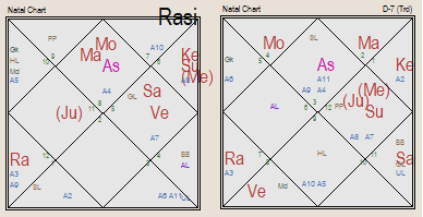 राहु दोनों कुंडली में 5वें स्थान में हैं जो पूर्व काल के सर्प दोष या परदादाओ के श्राप को स्पष्ट करता है. सूर्य जो सन्तान कारक है वह लग्न कुंडली में एकादश स्थान में केतु के साथ गूढ़ युति में है जो पुन: पितृदोष की तरफ इंगित करता है. दूसरी तरफ बृहस्पति पंचमेश है जो पाप ग्रह की राशि में है, राशि का स्वामी शनि द्वादशेश के साथ दशम में है तथा भाव स्वामी से समसप्तक है जो सन्तान का विरोधी है. लग्नेश नवांश तथा सप्तांश दोनों में द्वादश है. बृहस्पति गुरु शतभिषा में स्थित है जिसका स्वामी दोनों कुंडली में पंचम भाव में ही स्थित है, यह इंगित करता है कि पूर्व जन्म में जातक न केवल पितामहों बल्कि भृगुवंशी ब्राह्मणों को पीड़ित करने वाला भी रहा है.