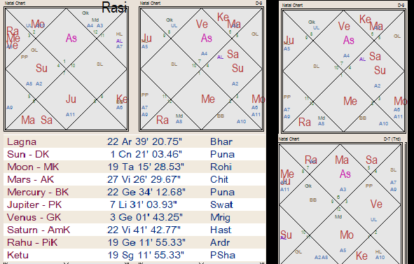 Priyanka Chopra married to Jonas in Jupiter mahadasha and Ketu antardasha which perfectly signify her marriage with a feigners and man from other culture. Jupiter is putra karak in inimical airy sign in airy nakshatra. He is again in airy common sign in Navamsha and Saptamsha is rising of a common sign Virgo where is conjunct with napunsak graha Mercury. Nakshatra lord is aspected by Saturn from 12th house. Hence Santan Karak is absolutely Negative, his position with 5th lord is also not to prosper the 5th house.