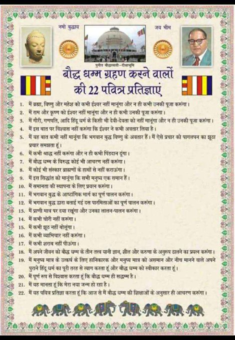 इन सबके बीच नरेंद्र मोदी के मिथ्याचार और बनियों के नव-मनुवाद के खिलाफ दलित-जनजातीय समाज ने मुहीम छेड़ दिया है. सोशल मीडिया पर दलित समाज के जागरूक नवयुवक, बुद्धिजीवी 22_जनवरी22प्रतिज्ञाएं ट्रेंड करा रहा है. ये 22 प्रतिज्ञाएँ डा. भीमराव अम्बेडकर की प्रतिज्ञा कही जाती हैं . इस फोटो में इस प्रकार लिस्टेड है ..